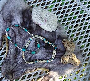 Here are some pictures of my black obsidion wand, deer handle with a turtle shell-rattle and the two fur skins of head of a gray/black fox, and brown coyote